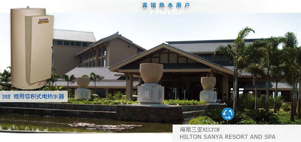 金茂三亚希尔顿大酒店是中国最高的大厦——金贸大厦及在业内享有盛誉的上海金贸君悦大酒店的业主——中国金贸(集团)股份有限公司在三亚亚龙湾的又一投资巨作。金贸聘请国际著名的豪华酒店品牌——希尔顿酒店管理公司,共同打造中国最好的渡假酒店。这也是希尔顿国际在中国的第一家全球渡家村。酒店位于有“中国的海岛天堂”美称的三亚,依美丽迷人的亚龙湾而建,该酒店属于典型的别墅渡假酒店风格,客房区由8栋大型分体别墅构成,由于A.O.史密斯DRE系列商用电热水炉具有独特的点对点供水系统模式,为该项目提供了非常优化的客房生活热水系统形式,每栋别墅单独一套系统,别墅之间的供水互不干扰,该项目采用11台DRE系列商用电热水炉,使用效果非常理想。