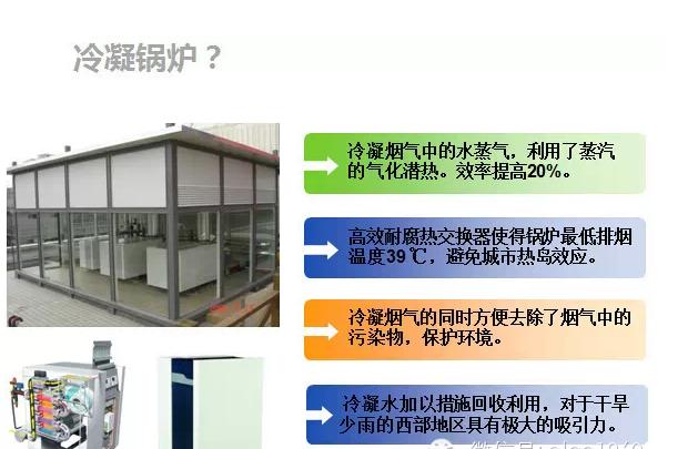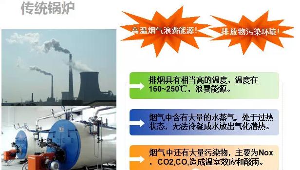 相比于普通传统锅炉,冷凝锅炉的热效率提高15~20%,烟气中有害物质的排放也仅为传统锅炉的10%。