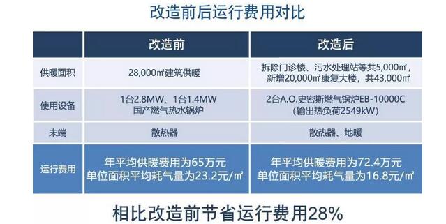 总务科相关人员介绍道,该院供暖周期约为7个月,当地气价为1.33元/㎡,他展示历年天然气发票,改造前平均每年供暖的燃气费是65万元,单位面积供暖费用相当于23.2元/㎡。改造后的燃气费总计为72.4万,相当于16.8元/㎡,和原来相比每平方供暖面积节省28%的运行费用。